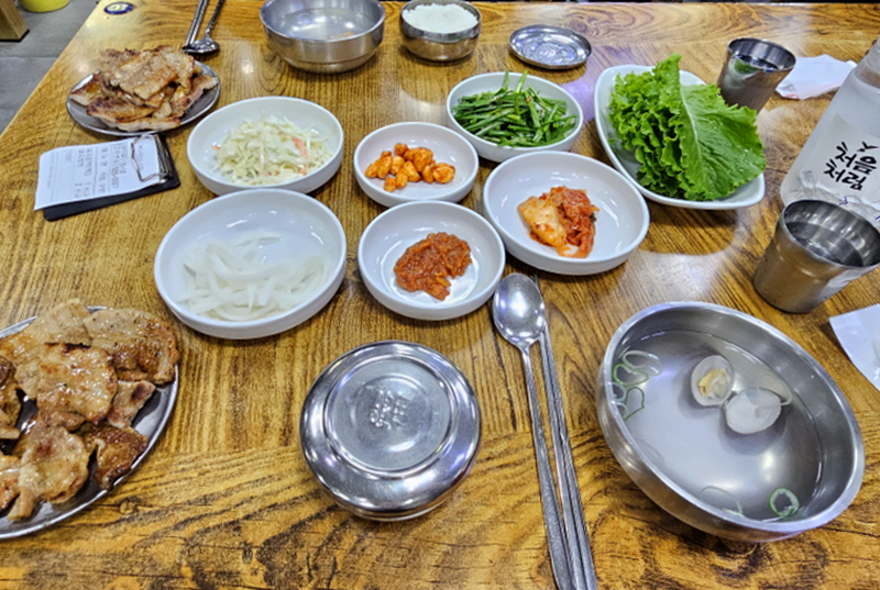 쌈장, 마늘무침, 샐러드, 무채, 부추무침, 상추와 조개국이 나왔어요.